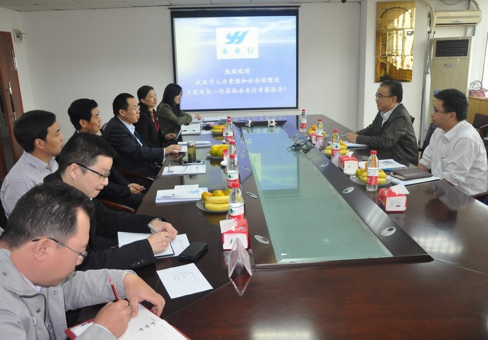 2013年10月22日,市人社局有关领导莅临永业行考察 2013-10-22   10月22日,武汉市人力资源和社会保障局市场管理处处长王星、市人才服务中心人事代理部副部长丁伟明来永业行考察并指导工作。 公司董事长方国成、总裁潘世炳、副总裁田新丑、综合管理部负责人杨雪莲、人力资源部负责人杨乐等热情接待了王处长一行。董事长方国成代表永业行对王处长、丁部长表示欢迎,总裁潘世炳介绍了公司发展历程、人力资源管理现状及公司未来发展规划;观看永业行专题片并听取公司情况介绍后,王处长等充分肯定了永业行取得的成绩,并从公司发展战略及人力资源建设等方面提出了好的建议;大家就大学生就业实习基地建设与发展、人才战略等有关内容展开了热烈交流。   MORE